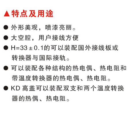 ●KD高蓋可以裝配雙支和兩個溫度轉換器的熱電偶、熱電阻。