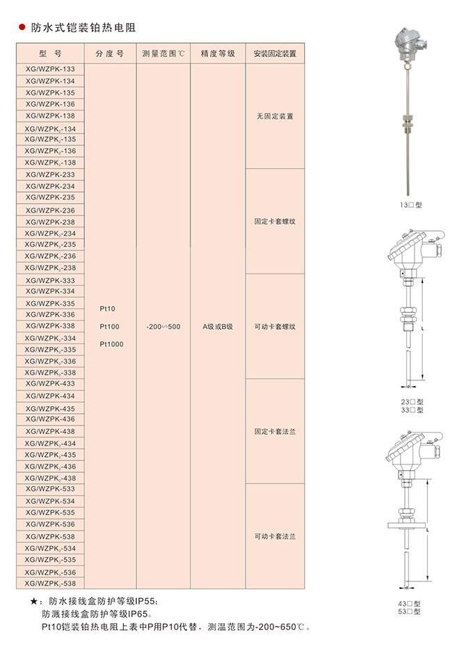 3)Pt10鎧裝鉑熱電阻上表中 P 用P10代替,測溫范圍為﹣200~650C。