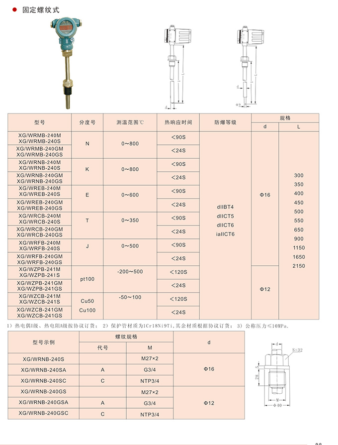 固定螺紋式,現(xiàn)場(chǎng)顯示一體化熱電偶(阻)一種新型結(jié)構(gòu)的測(cè)溫儀表,現(xiàn)場(chǎng)LCD或LED數(shù)字顯示,溫度變送器二線4~20mA.DC信號(hào)輸出,感溫元件可采用鎧裝壓簧式抗震結(jié)構(gòu),感溫元件與上保護(hù)管采用圓筒隔爆結(jié)