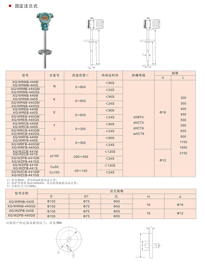 固定法蘭式,現(xiàn)場(chǎng)顯示一體化熱電偶(阻)一種新型結(jié)構(gòu)的測(cè)溫儀表,現(xiàn)場(chǎng)LCD或LED數(shù)字顯示,溫度變送器二線4~20mA.DC信號(hào)輸出,感溫元件可采用鎧裝壓簧式抗震結(jié)構(gòu),感溫元件與上保護(hù)管采用圓筒隔爆結(jié)