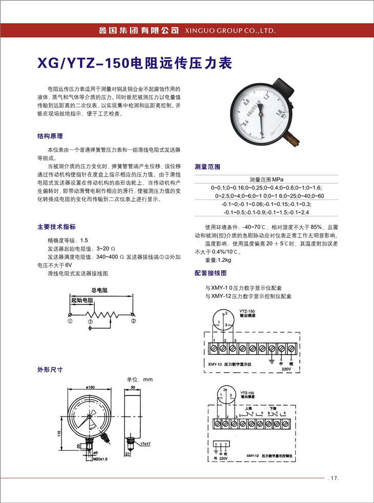 電阻遠傳壓力表由一個普通彈簧管壓力表和一組滑線電阻式發(fā)送器等組成。當被測介質(zhì)的壓力變化時,彈簧管管端產(chǎn)生位移,該位移通過傳動機構使指針在度盤上指示相應的壓力值。由于滑線電阻式發(fā)送器設置在傳動機構的扇形齒輪上,當傳動機構產(chǎn)生偏轉時,即帶動滑臂電刷作相應的滑行,使被測壓力值的變化轉換成電阻的變化而傳輸?shù)蕉蝺x表上進行顯示。