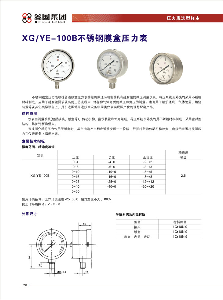 不銹鋼膜盒壓力表根據普通膜盒壓力表的結構原理而研制的具有耐腐蝕的微壓測量儀表。導壓系統及外殼均采用不銹鋼材料制成。不銹鋼膜盒壓力表應用于耐腐蝕要求較高的工藝流程中,對各種氣體介質的微壓和負壓的測量。