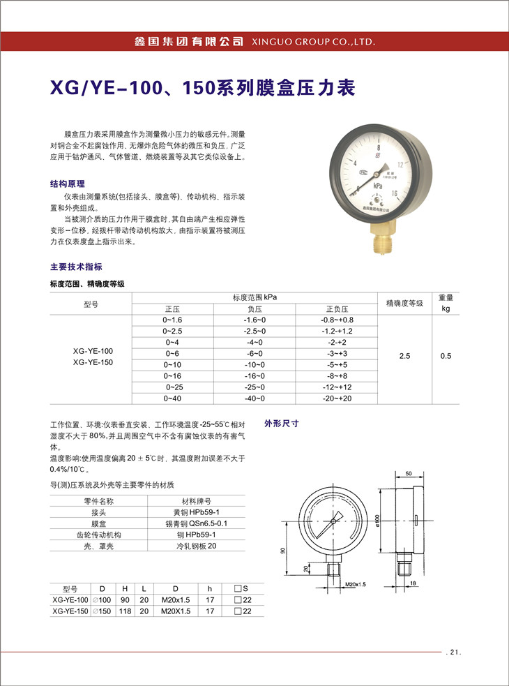 膜盒壓力表采用膜盒作為測量微小壓力的敏 感元件,測量對銅合金不起腐蝕作用,無爆炸危險(xiǎn)氣體的微壓和負(fù)壓。膜盒壓力表廣泛應(yīng)用于鈷爐通風(fēng)、氣體管道、燃燒裝置等及其它類似設(shè)備上。